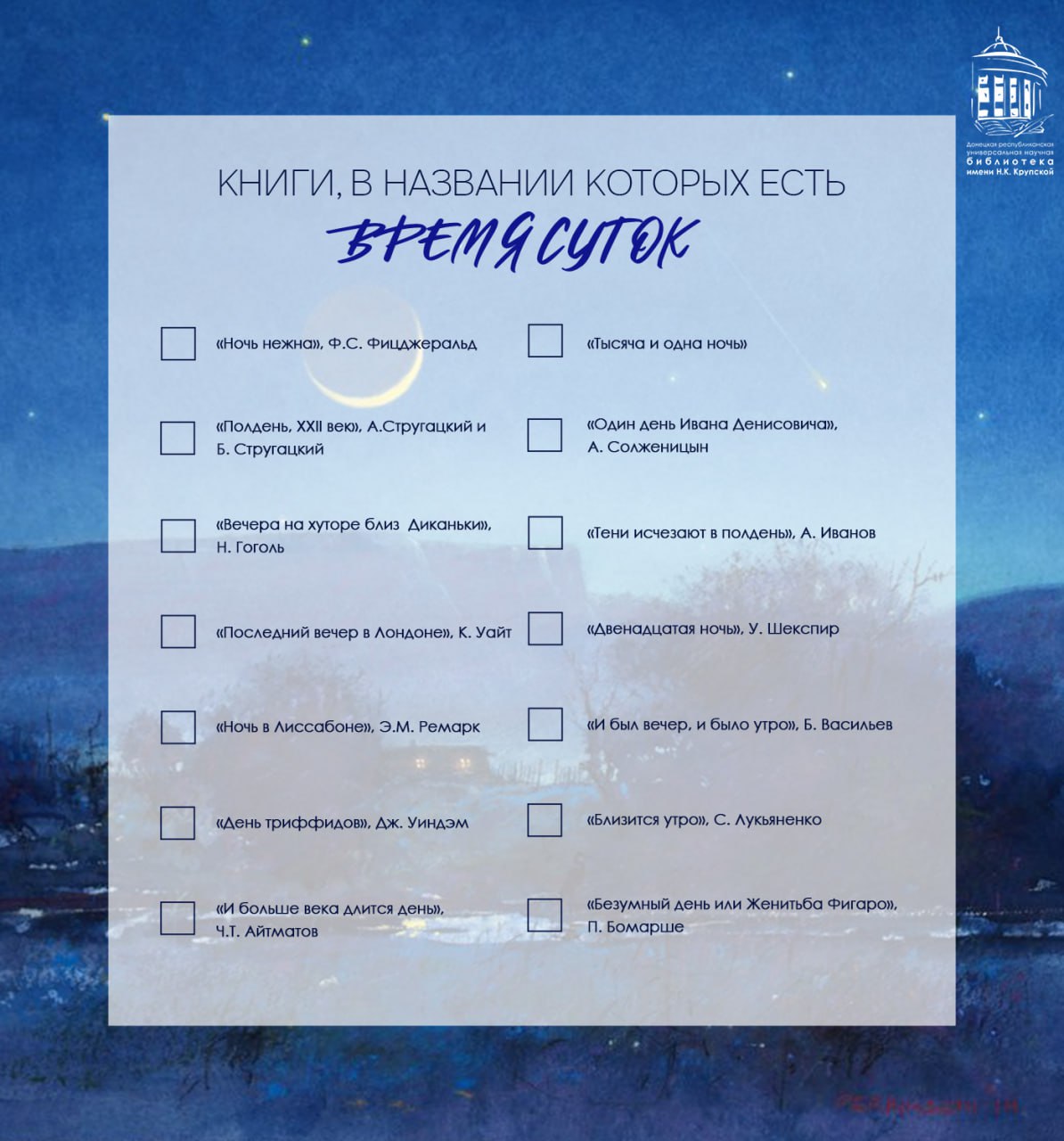 В октябре мы подготовили для вас чек-лист с книгами, в названии которых есть время суток. Рекомендуем скорее подобрать интересную книгу для прочтения!