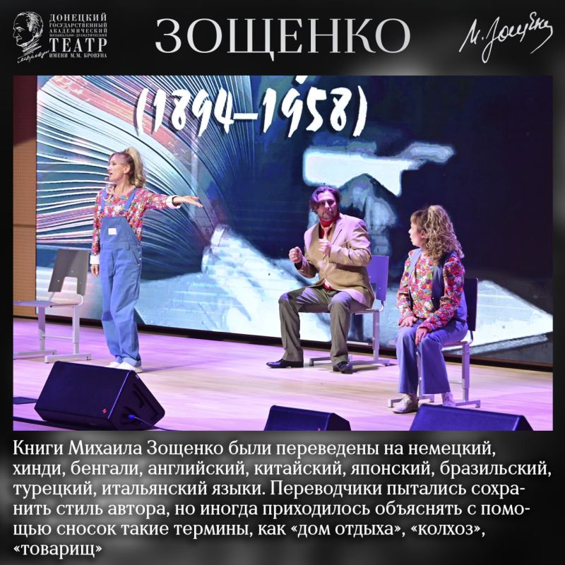 Произведения Михаила Михайловича Зощенко пользовались огромной популярностью не только у современников, но и продолжают радовать до сих пор. В октябре артисты МДТ имени М.М. Бровуна в рамках культурно-просветительского проекта «Культура для школьников», инициированного Министерством культуры ДНР и Министерством образования и науки ДНР, представили учащимся старших классов Тореза и Мариуполя музыкально-литературную композицию режиссёра Владимира Быковского «Зощенко. Рассказы».