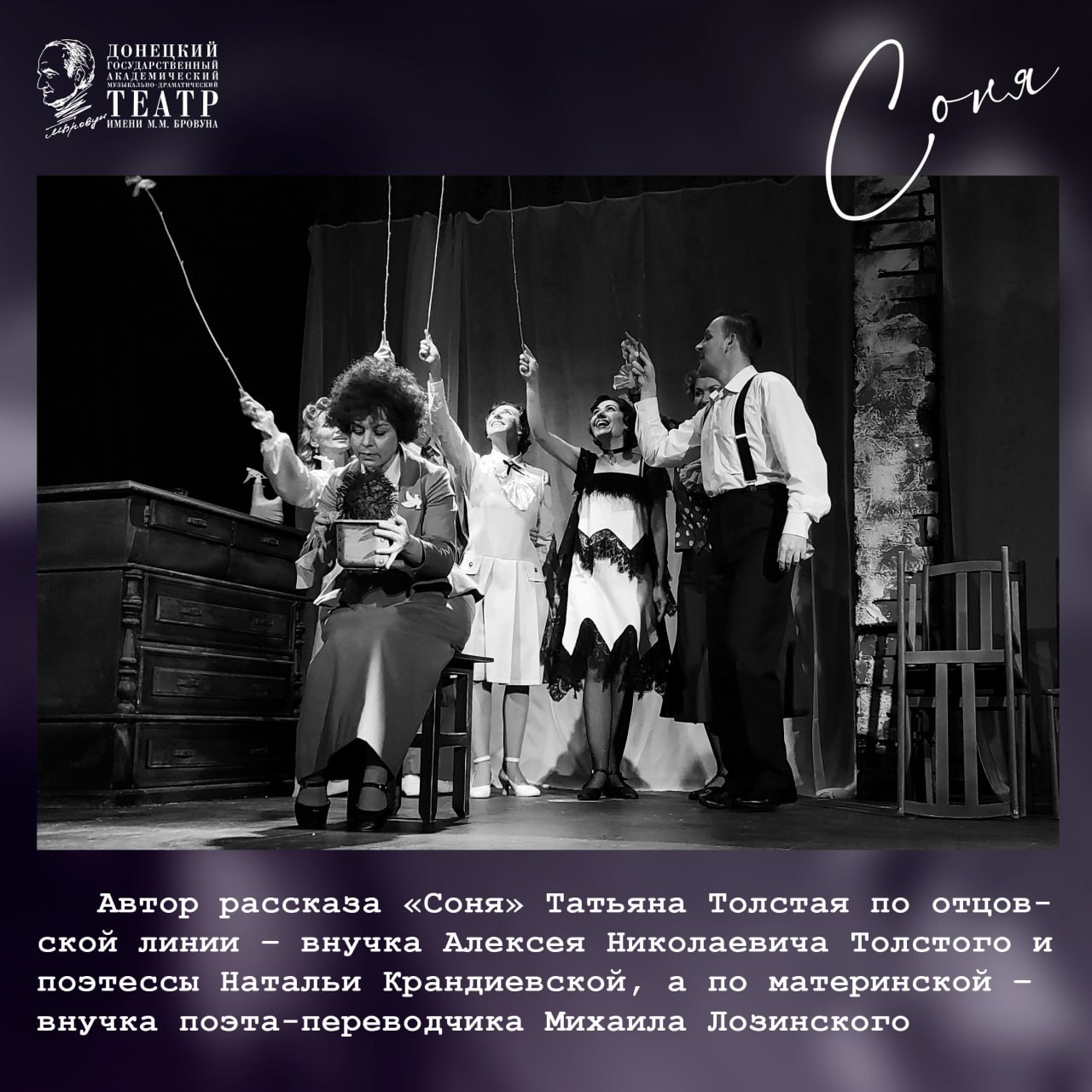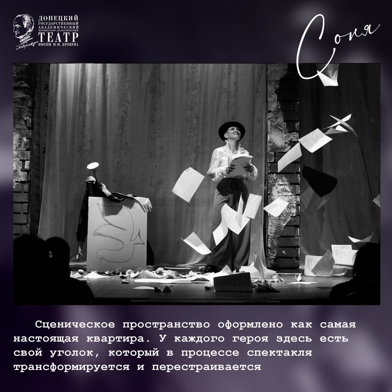Драма «Соня» стала первой премьерой 98 театрального сезона в МДТ имени М.М. Бровуна. С тех пор она с успехом идёт на камерной площадке Донецкой муздрамы. 13 декабря с героями этой пронзительной истории о высоких чувствах встретились зрители Сцены на Садовом.