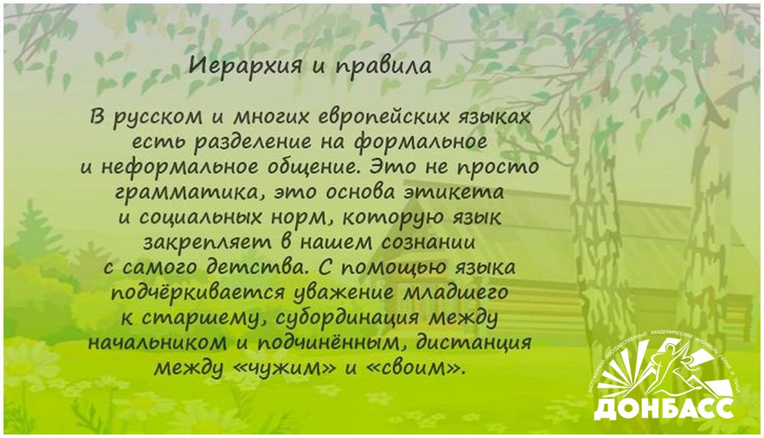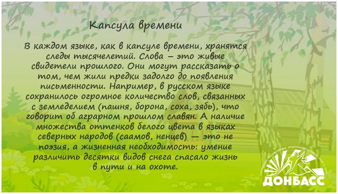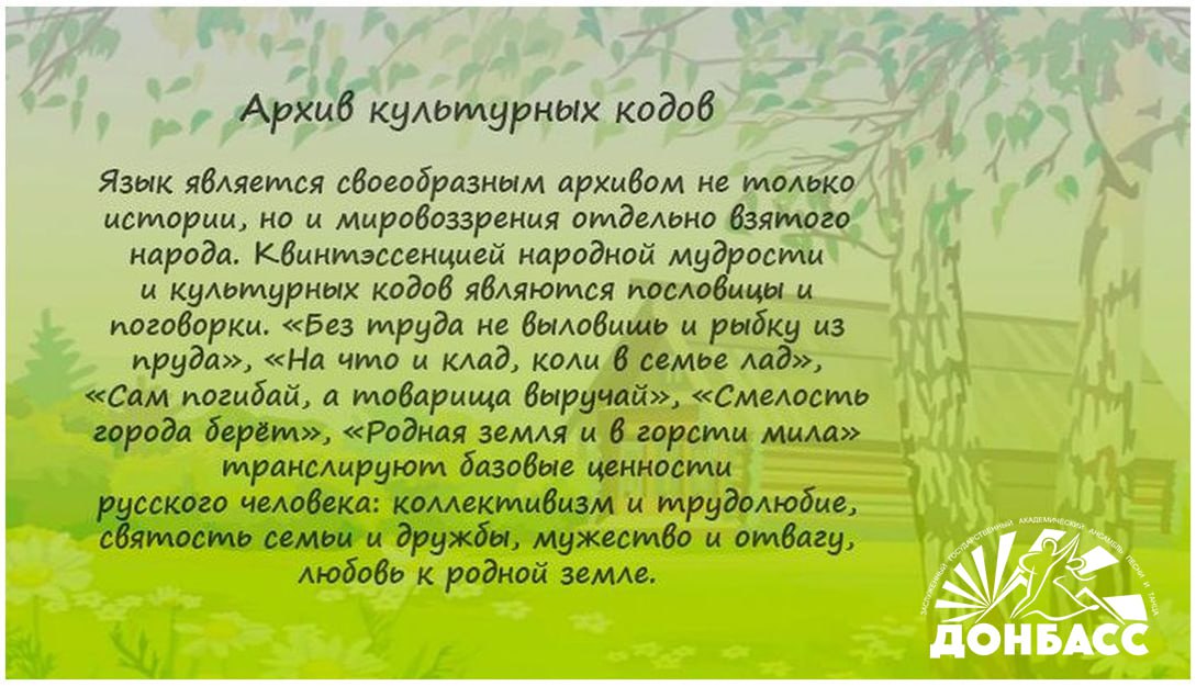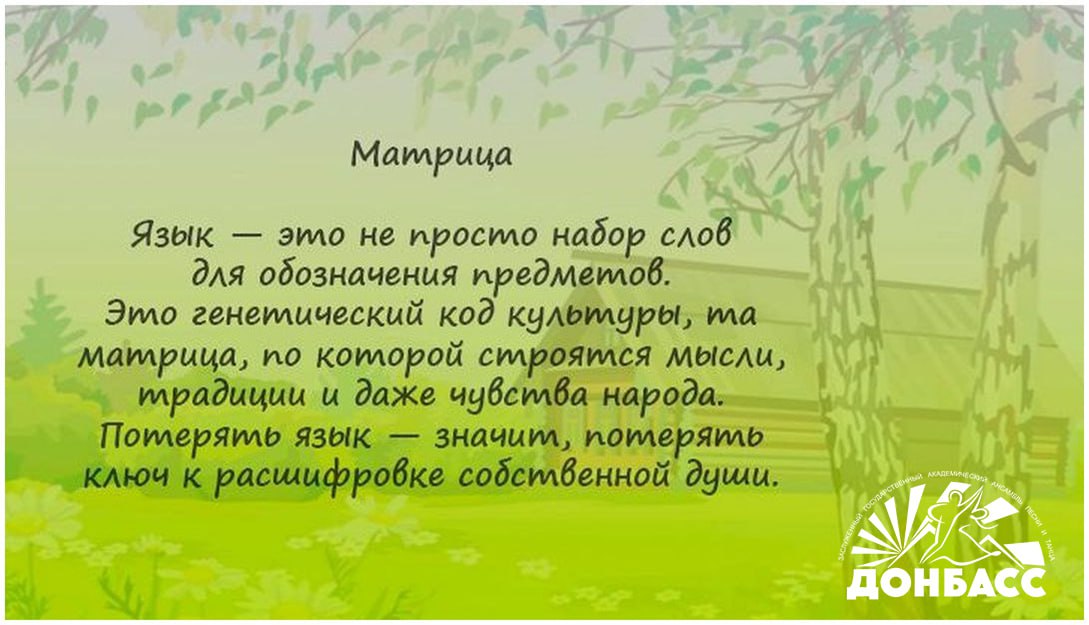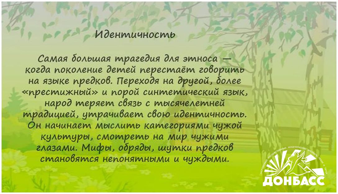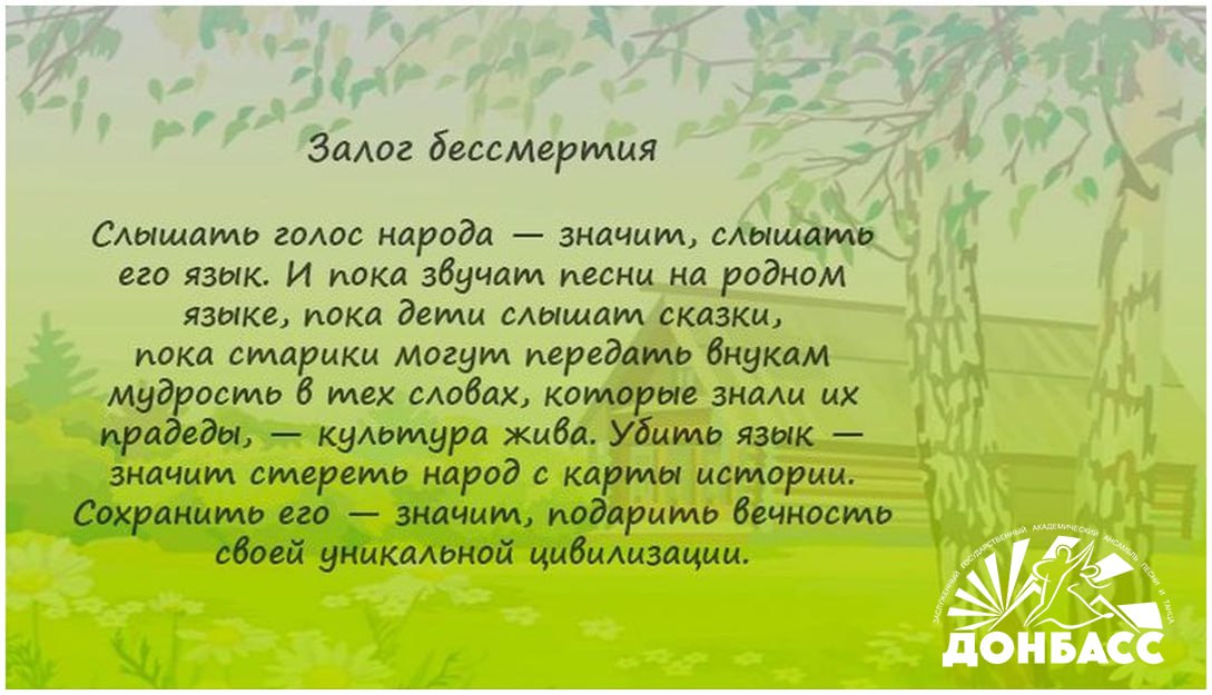 В Донбассе проживают представители свыше 100 национальностей. Русский язык для них является языком межнационального общения, главным и родным. Но при этом у каждого этноса есть и свой собственный неповторимый язык, который очень важно сохранять и передавать от поколения к поколению.