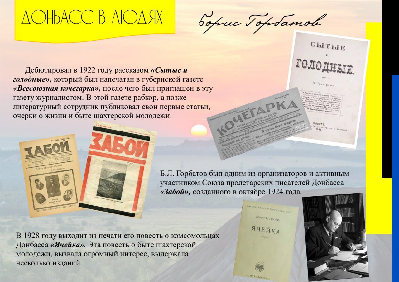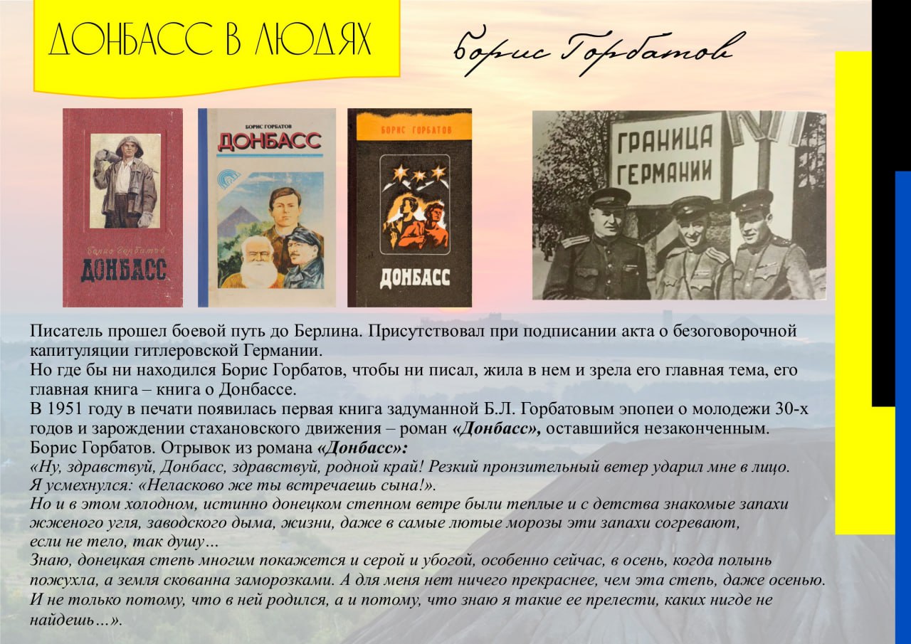 Третий выпуск краеведческой рубрики, посвящённой людям, прославившим наш край своими талантами и добрыми делами «Донбасс в людях» знакомит вас с автором романа «Донбасс» Борисом Горбатовым.