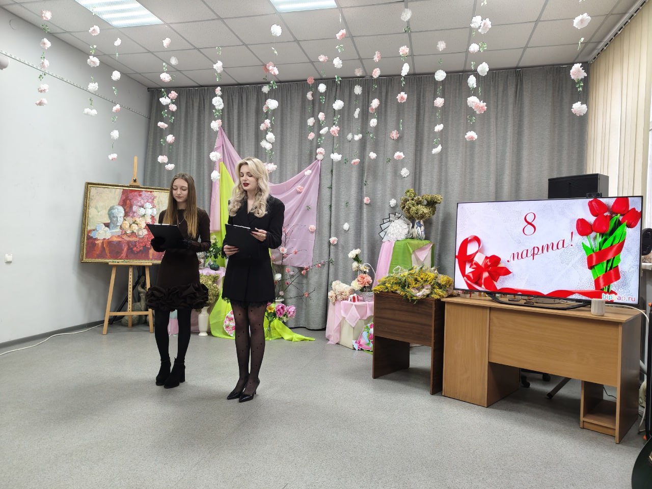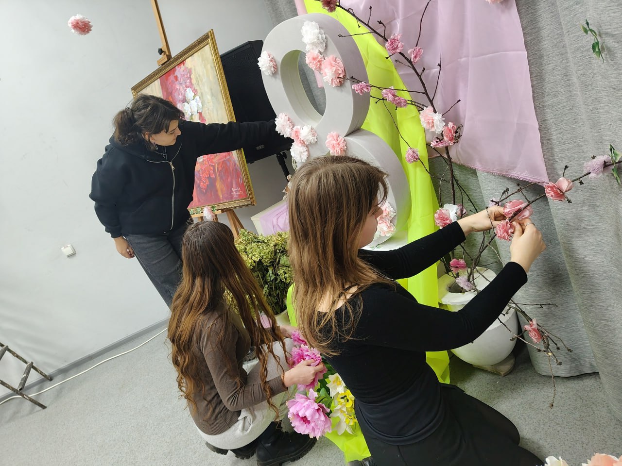 С самого утра 6 марта в колледже царила предпраздничная атмосфера. Ведь будущие художники создали уникальную тематическую фотозону. В центре композиции разместили ветку сакуры ручной работы, а вокруг расположили композиции из цветов, коробки с подарками и живописную картину.