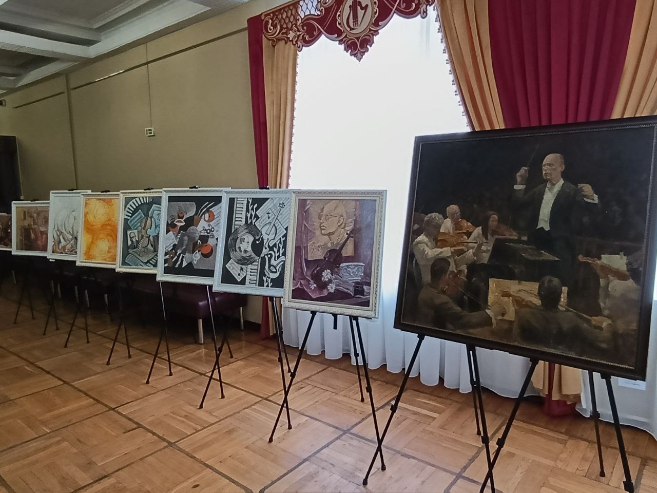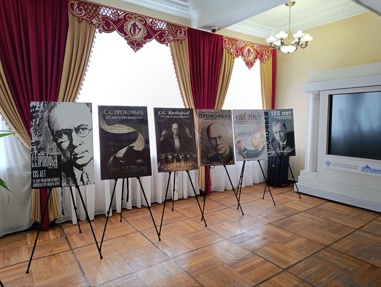 На выставке представлены 20 работ – тематические плакаты, живописные натюрморты, ассоциативные, в том числе коллажные композиции, сюжетные картины, а также портреты С.С. Прокофьева.