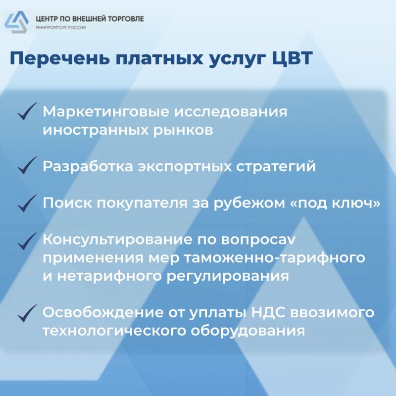 Центр по внешней торговле(ЦВТ) при Минпромторге России помогает российским компаниям выйти на внешние рынки.