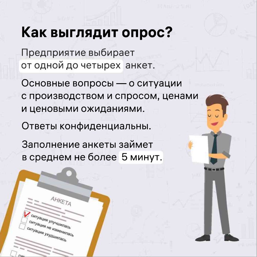 О том, что такое мониторинг предприятий и как выглядит опрос, смотрите в карточках
