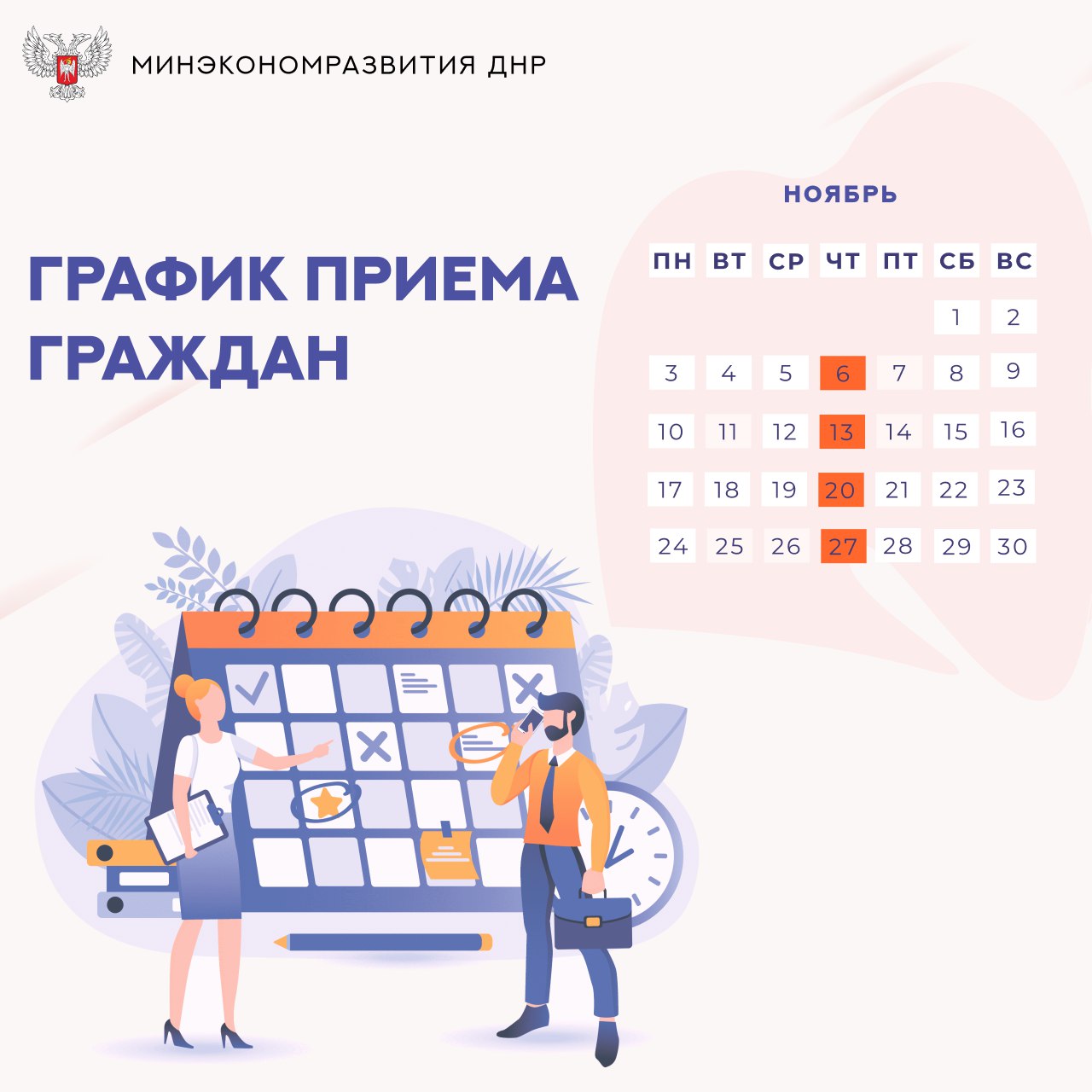 Сообщаем о датах приема граждан руководством Минэкономразвития ДНР в ноябре 2025 года: