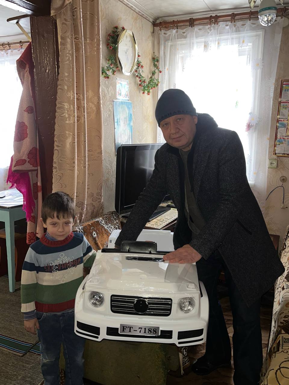 Поздравил одного из юных участников, Диму, с наступающим праздником, вручив ему долгожданный подарок.