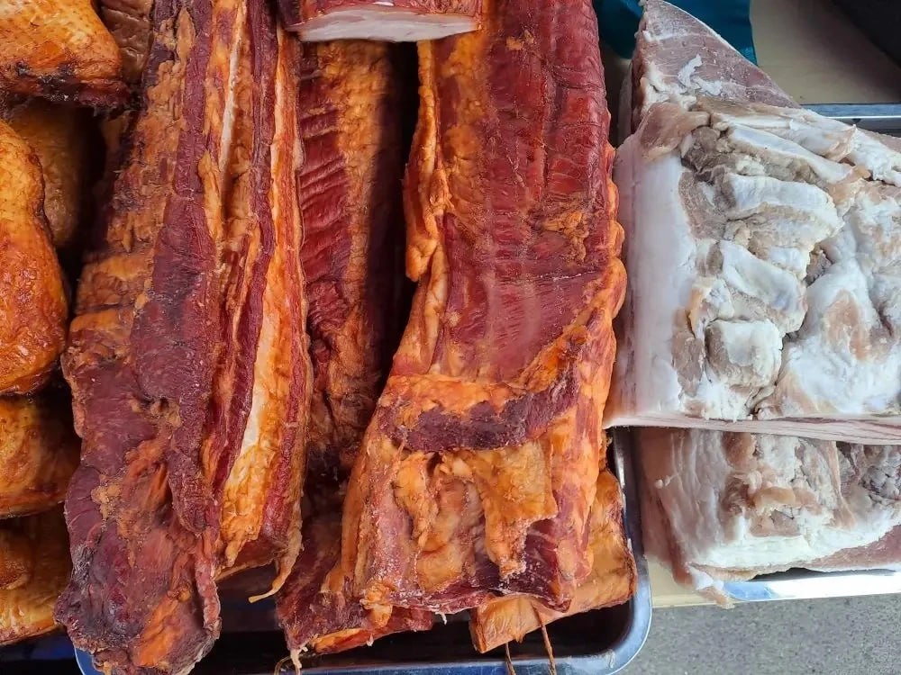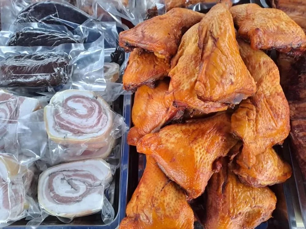 На прилавках ярмарки были представлены свежие и натуральные товары, среди которых: выпечка, разнообразные виды колбас, а также свежие овощи и фрукты.