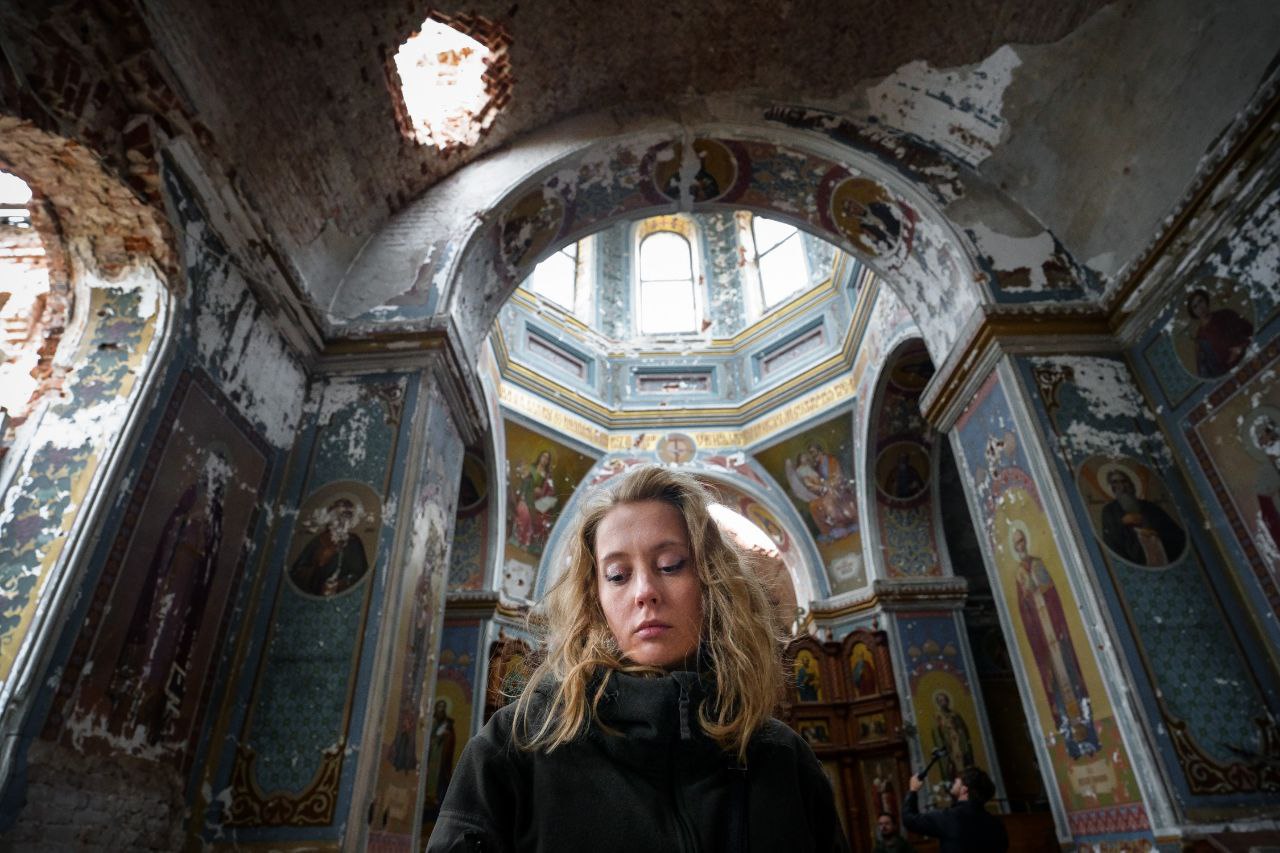 Журналист и телеведущая канала "Спас" Вероника Иващенко в разрушенном обстрелами ВСУ храме в селе Никольское.