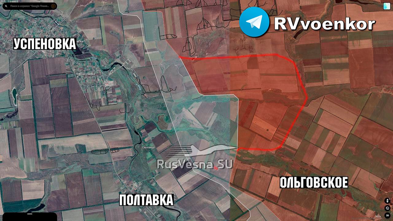 Севернее Ольговского российские войска закрыли «карман» площадью до 6,6 км. Бои идут в районе Полтавки и в направлении Успеновки, признают вражеские аналитики, публикующие карты.