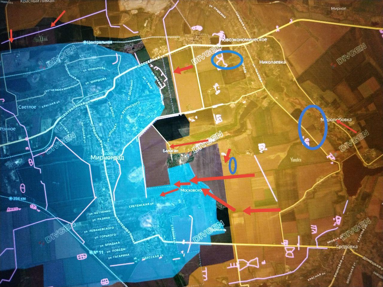 Главным событием на данном участке Покровского направления является прорыв ВС РФ из района Гродовки (в обход Проминя севернее) в Московское (Казацкое) и далее, с форсированием р. Сенная, в частный сектор на восточной окраине Мирнограда (в районе ул. Седова).