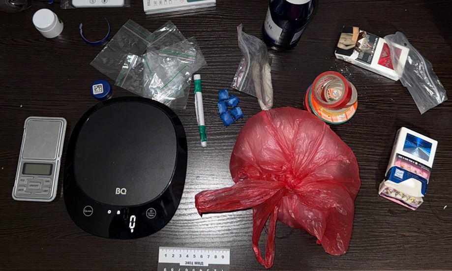 При проведении обыска в двух съемных квартирах, в которых проживал фигурант, полицейские обнаружили и изъяли 7 мотков изоленты разных цветов, мобильный телефон, кухонные весы, зип-пакеты для фасовки, 7 свёртков и пакет с наркотическим веществом общим весом 200 граммов.