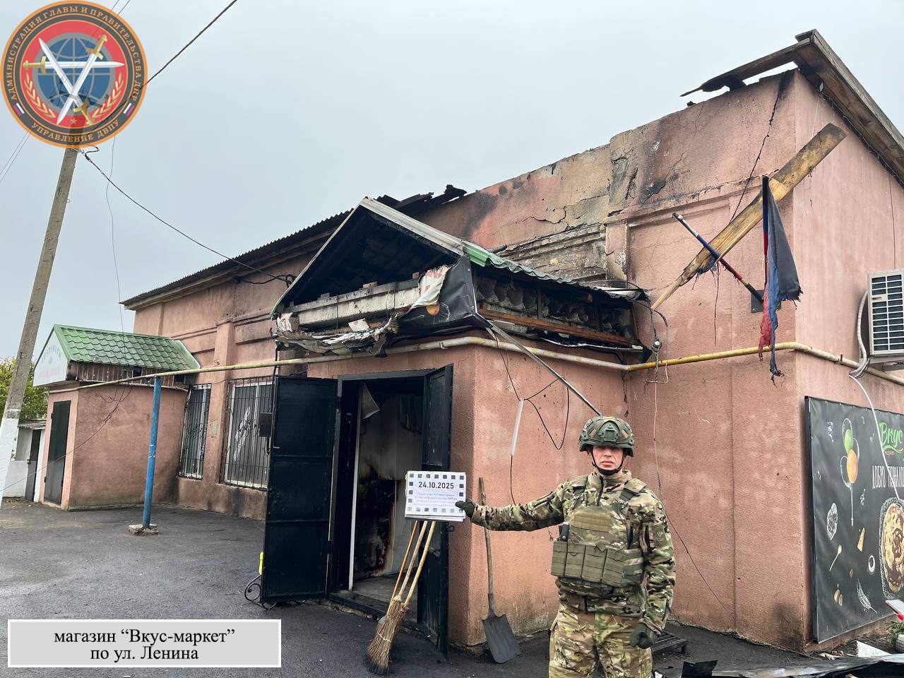 Зафиксировано прямое попадание ударного БПЛА в кровлю магазина "Вкус-маркет" по ул. Ленина. Вследствие возникшего пожара повреждена кровля, остекление, внутренняя отделка и фасад торгового объекта, а также ЛЭП.