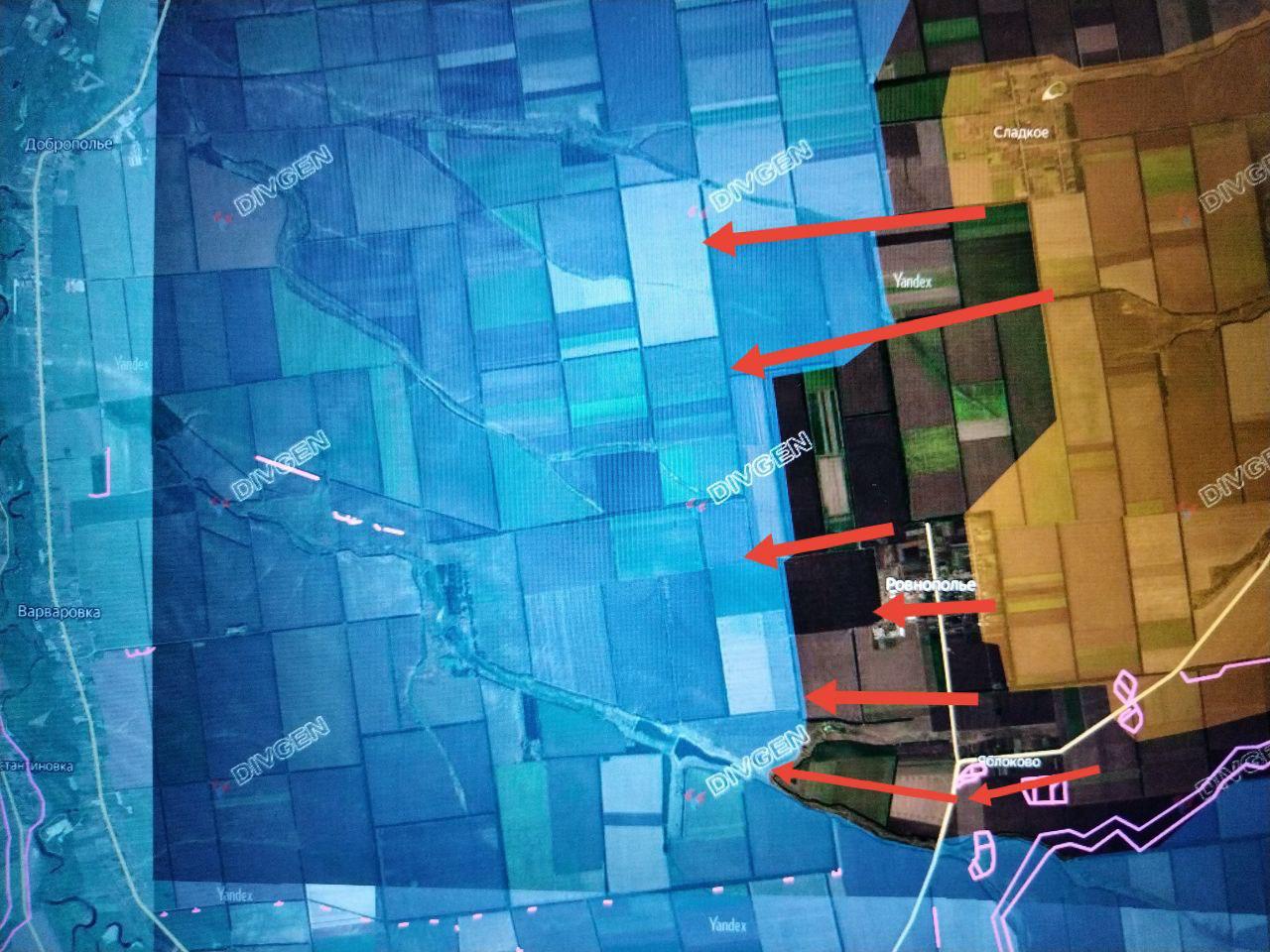 Южнее, на Гуляйпольском участке, наши подразделения взяли под контроль Ровнополье и Яблоково и продвинулись западнее в направлении Доброполья и Варваровки на дороге Покровское — Гуляйполе, охватывая Гуляйполе с севера и обходя укрепрайон ВСУ восточнее последнего.