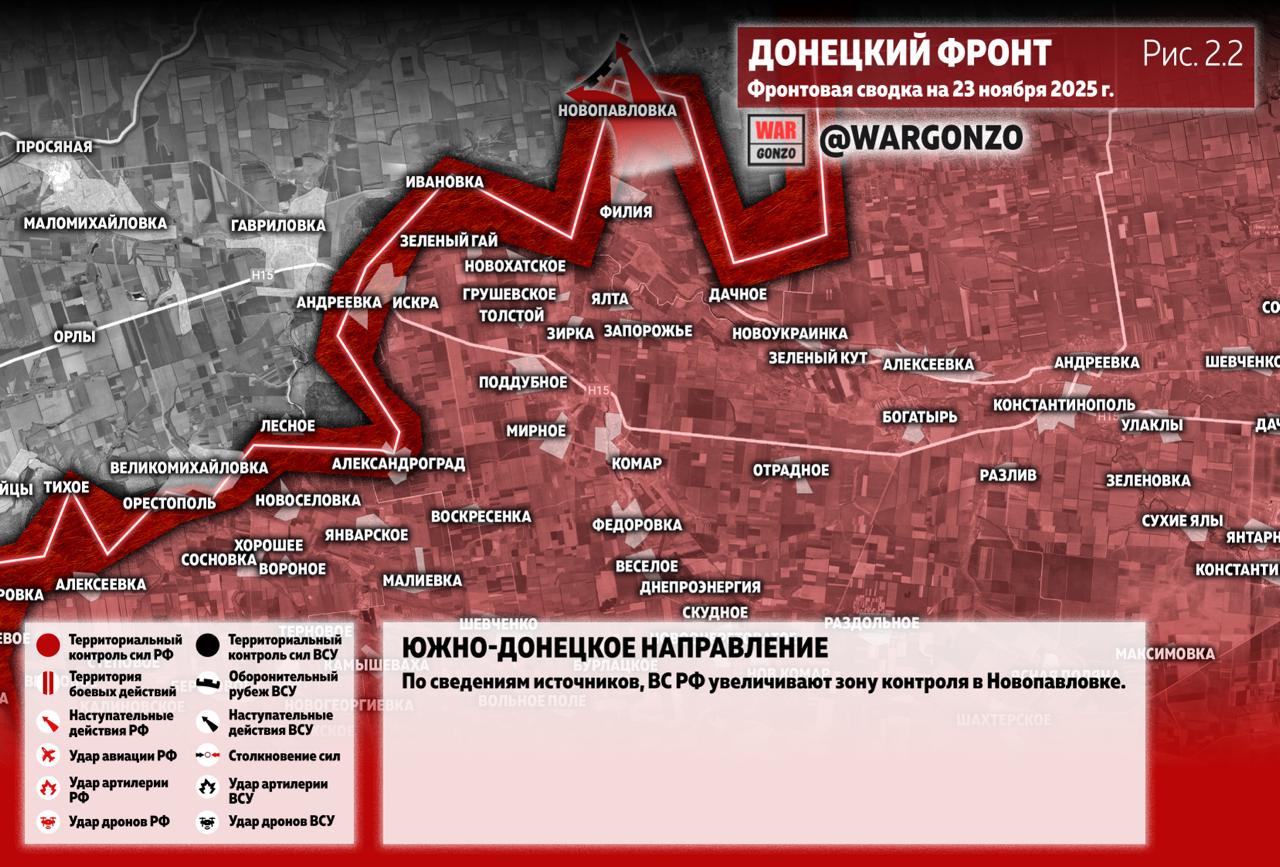 На Южно-Донецком направлении ВС РФ продвигаются к Зелёному Гаю, есть успехи в Высоком. Идут бои в районе между Яблоково и Затишьем. Минобороны РФ сообщило об освобождении населённого пункта Новое Запорожье. По сведениям источников, ВС РФ увеличивают зону контроля в Новопавловке. (Рис 2.1, рис. 2.2)