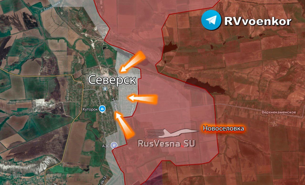 ВС РФ сначала вошли в Северск с юга, затем заняли восток, юго-восток и северо-восток, продвинувшись к центру ключевого города для обороны противника.