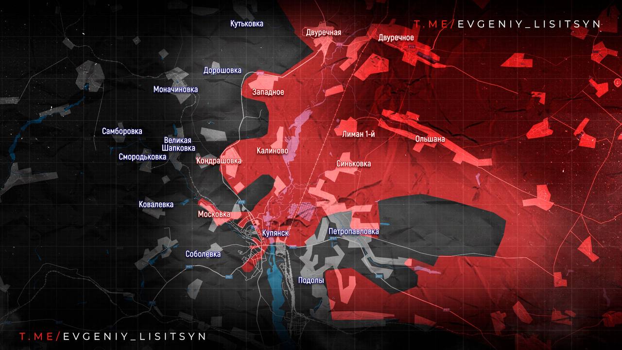 Купянское направление: Продолжаются ожесточённые городские бои на истощение. Наши подразделения удерживают промзону и северную часть города, ведут штурм Тищенково и позиций у Куриловки.