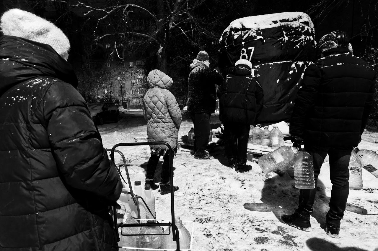 Мужчина расстегнул утепляющий чехол, постучал несколько раз по бочке и жестом дал понять, что воды осталось немного. За его спиной было десять человек с пустыми бутылками и ведрами. Люди все чаще поглядывали на снег.