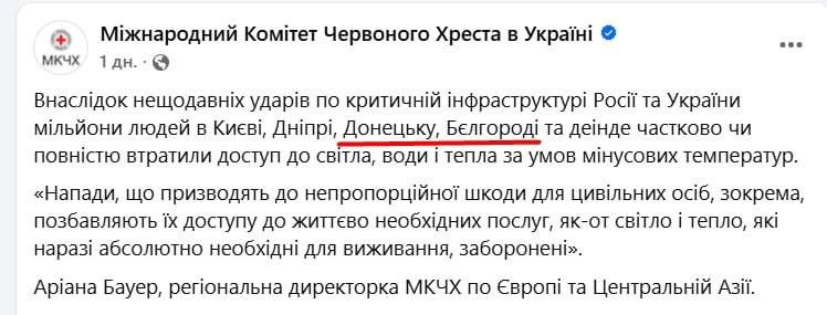 Тут Красный крест порвал дупу Сибиге иностранных дел: «Недавние удары по объектам критической инфраструктуры на Украине и в России оставили миллионы людей практически без электричества, воды и отопления в условиях низких температур в Киеве, Днепре, Донецке, Белгороде и других районах».