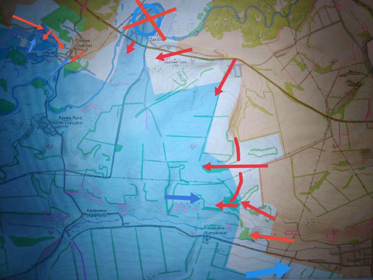 Из Закотного наши подразделения продвигаются по склону у юго-западной окраины к меловому карьеру, где противник оборудовал несколько позиций. Взятие этих высот позволит нашим подразделениям выйти непосредственно к Кривой Луке.