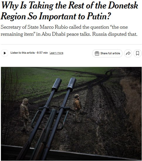 Контроль России над Донбассом даст Москве выгодную стартовую позицию для возможной новой фазы наступления, пишет New York Times.