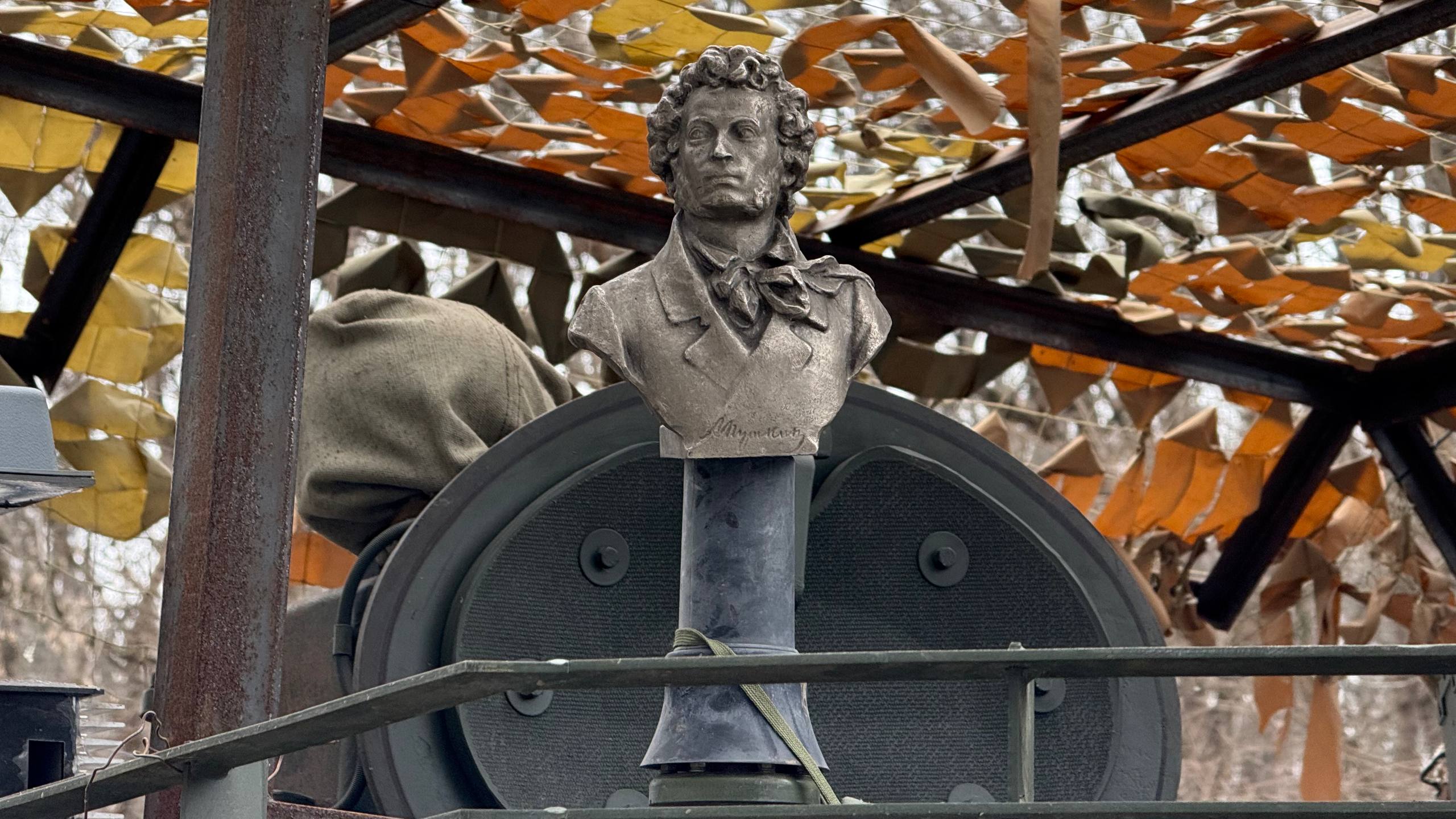 Неловко плюхнувшись на холодное железо, обнаруживаю по правую руку наше всё с тыловой стороны башни к металлическому выступу прилажен натертый до блеска бюст Пушкина.