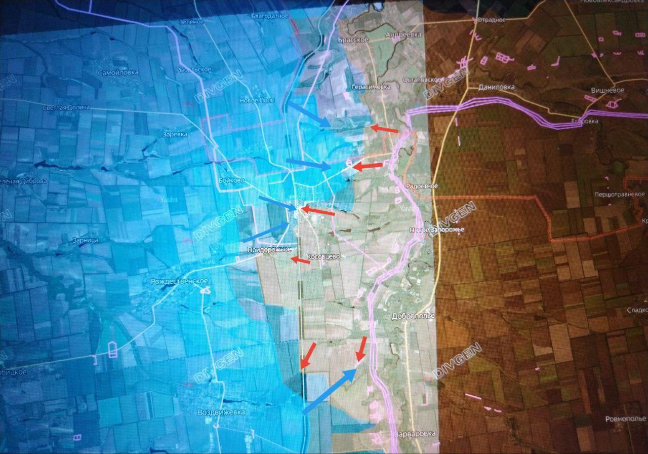 Противник пока не успокоился, бросает в контратаки личный состав колоннами на бронетехнике и малыми штурмовыми группами, пытаясь остановить наступление войск группировки в направлении Орехова, Запорожья и Покровского.