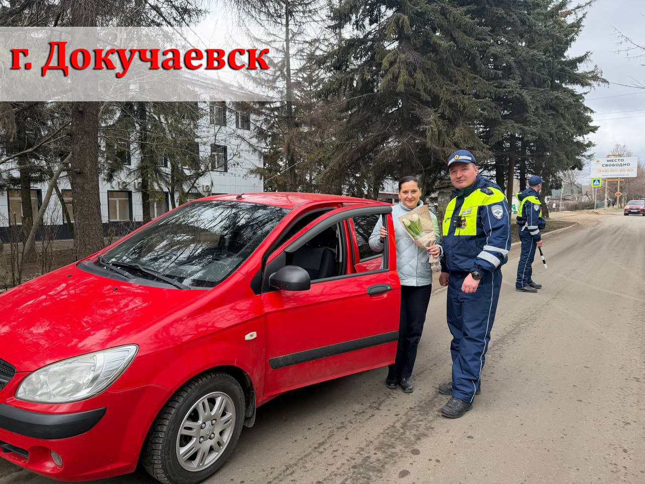 Сотрудники ГАИ останавливают автомобили, за рулём которых прекрасные женщины-водители, и поздравляют их с Международным женским днём, вручая цветы и памятные открытки с тёплыми пожеланиями.