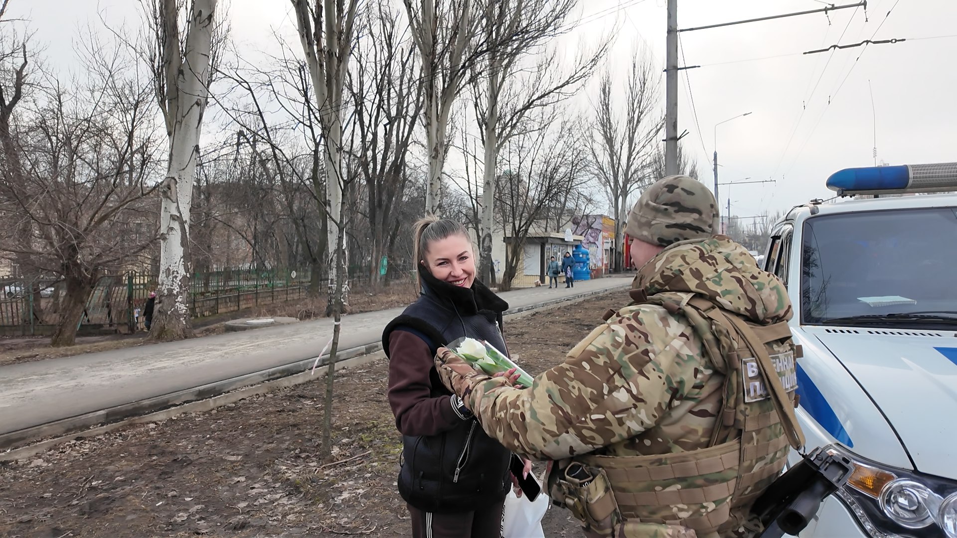 Военнослужащие организовали праздничную акцию: останавливали проезжающие автомобили, за рулём которых находились женщины, и поздравляли их с праздником, даря цветы и тёплые слова.