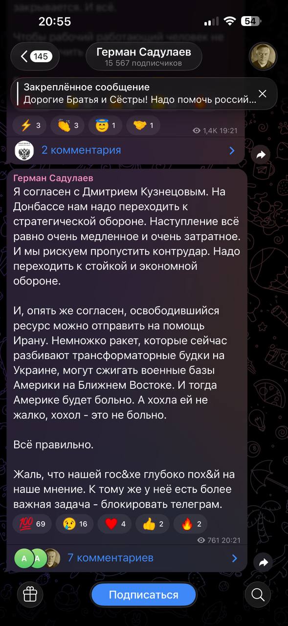 Тут Герман Садулаев (кстати, кто это?) предлагает забить на оккупированный ДНР а также непосредственного врага у своей границы и срочно помочь Ирану. Сетует, что на его ценное мнение кому-то глубоко похуй. Я не буду подробно расписывать почему он глупость сморозил, но хочу сказать, что к счастью, реально похуй тем от кого это зависит. И на всякий случай добавлю, что мне лично тоже.