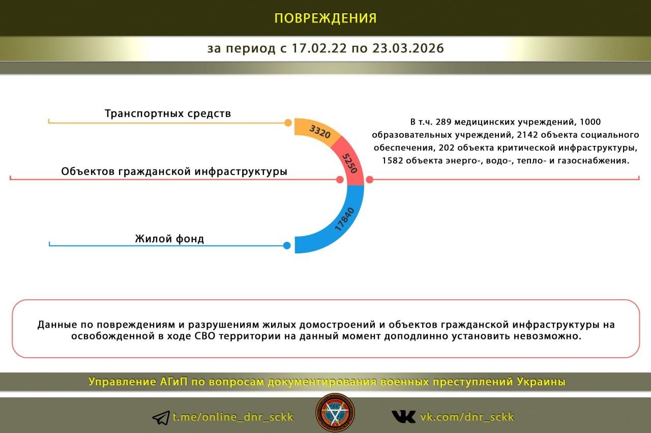 Официально о последствиях вооруженных атак ВСУ на территории Республики (за период с 17.02.2022 по 23.03.2026; 23:00).