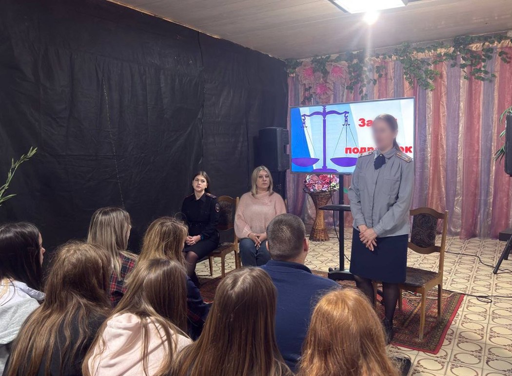 В ходе беседы с учащимися 9 классов ГБОУ «Школа №46 г.о. Донецк», которая прошла в рамках работы по профилактике правонарушений и преступлений среди несовершеннолетних, начальник филиала уголовно-исполнительной инспекции рассказала о важности законопослушного поведения, об административной и уголовной ответственности несовершеннолетних, правилах поведения в быту и обществе. Также акцентировала внимание школьников на меры административного воздействия, которые могут быть применены как к несовершеннолетним, так и к их родителям. Особое внимание было обращено на тему буллинга среди несовершеннолетних и недопустимость совершения преступлений террористической и экстремистской направленности.
