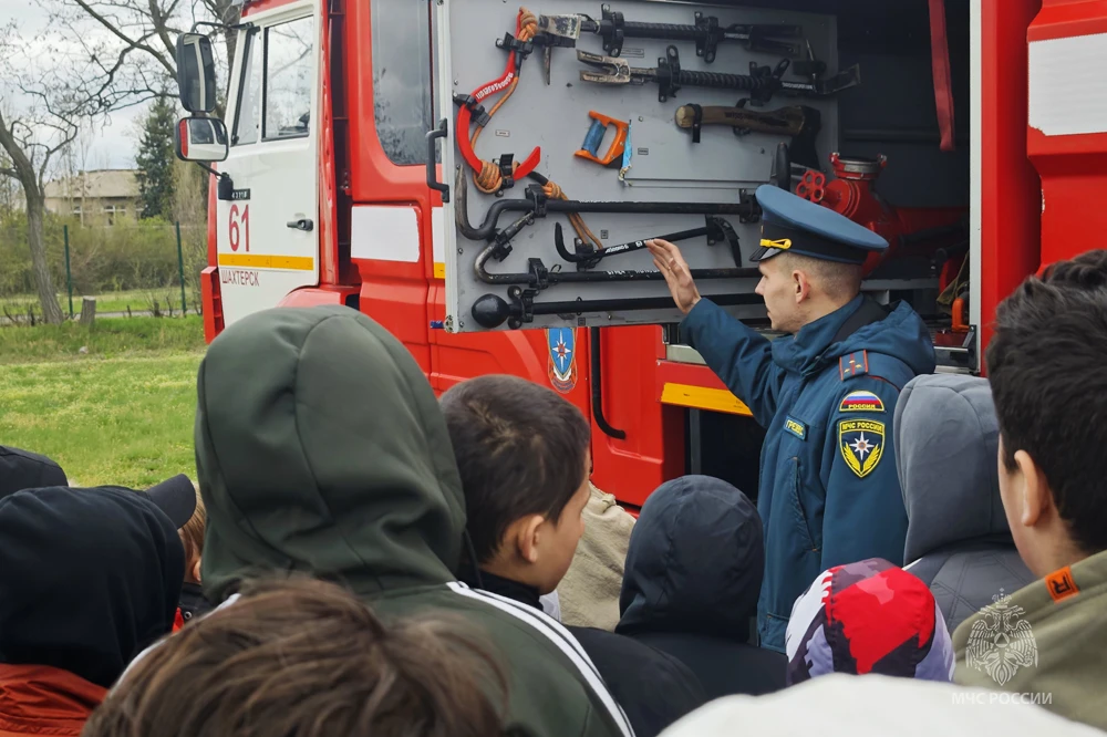 Огнеборцы продемонстрировали школьникам пожарную автоцистерну, специальные инструменты и защитную одежду.