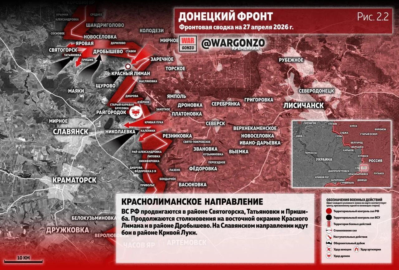 На Краснолиманском направлении ВС РФ продвигаются в районе Святогорска, Татьяновки и Пришиба. Продолжаются столкновения на восточной окраине Красного Лимана и в районе Дробышево. На Славянском направлении идут бои в районе Кривой Луки. (Рис. 2.2)