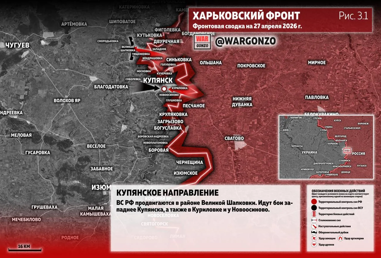 На Купянском направлении ВС РФ продвигаются в районе Великой Шапковки. Идут бои западнее Купянска, а также в Куриловке и у Новоосиново. (Рис. 3.1)