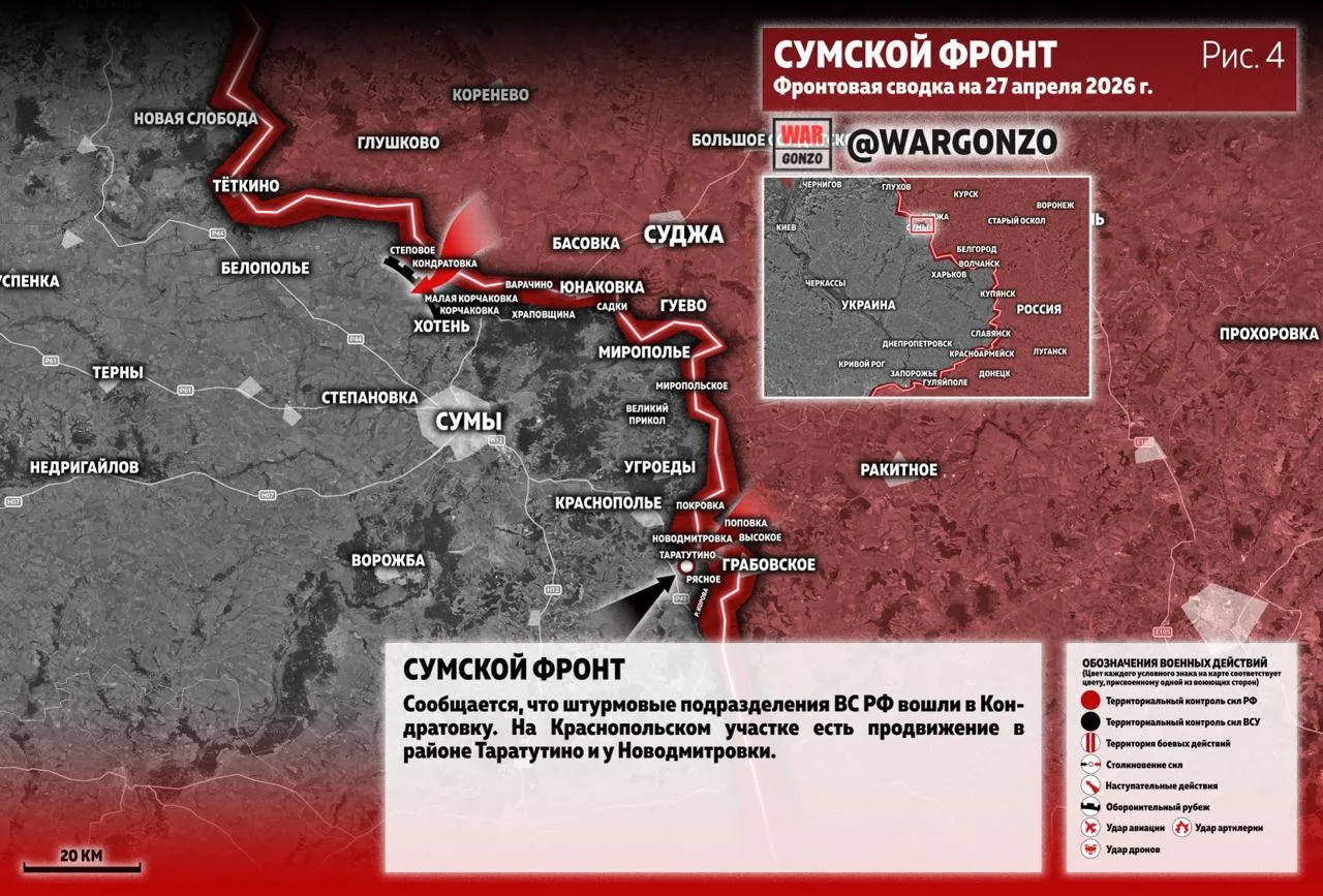 Сообщается, что штурмовые подразделения ВС РФ вошли в Кондратовку. На Краснопольском участке есть продвижение в районе Таратутино и у Новодмитровки. (Рис. 4)