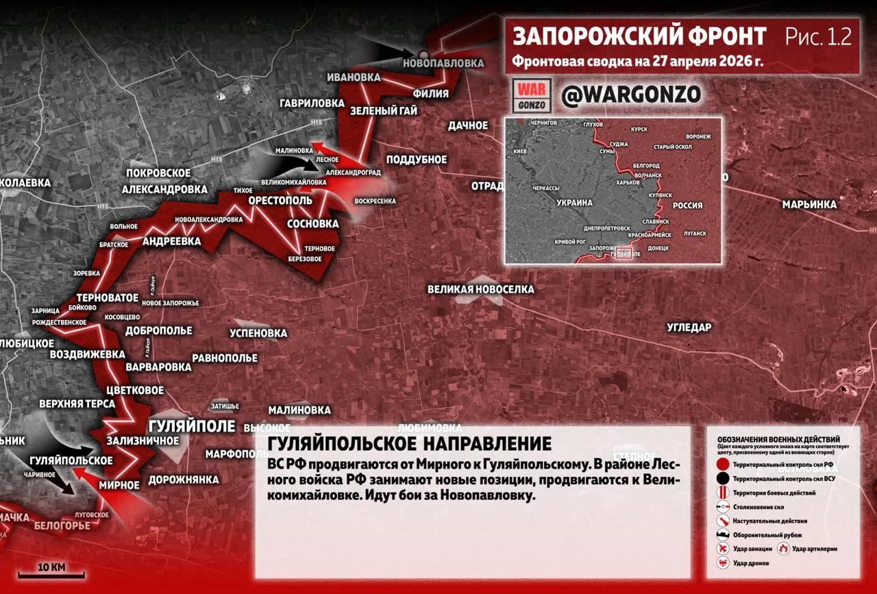 На Гуляйпольском направлении ВС РФ продвигаются от Мирного к Гуляйпольскому. В районе Лесного войска РФ занимают новые позиции, продвигаются к Великомихайловке. Идут бои за Новопавловку. (Рис. 1.2)