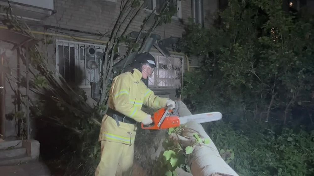 Студенты-спасатели распилили и убрали упавшее дерево в одном из дворов Донецка, чтобы освободить въезд и пешеходную часть.