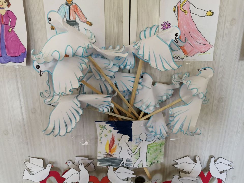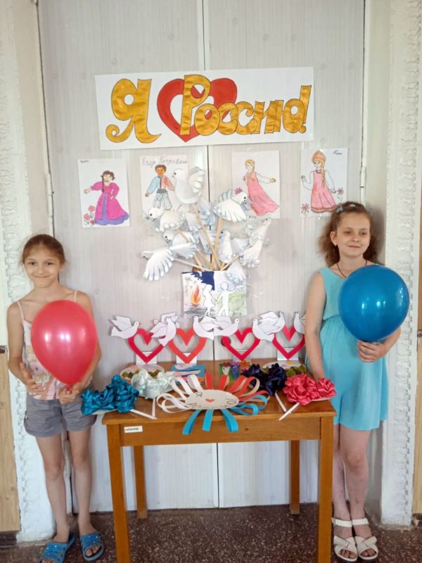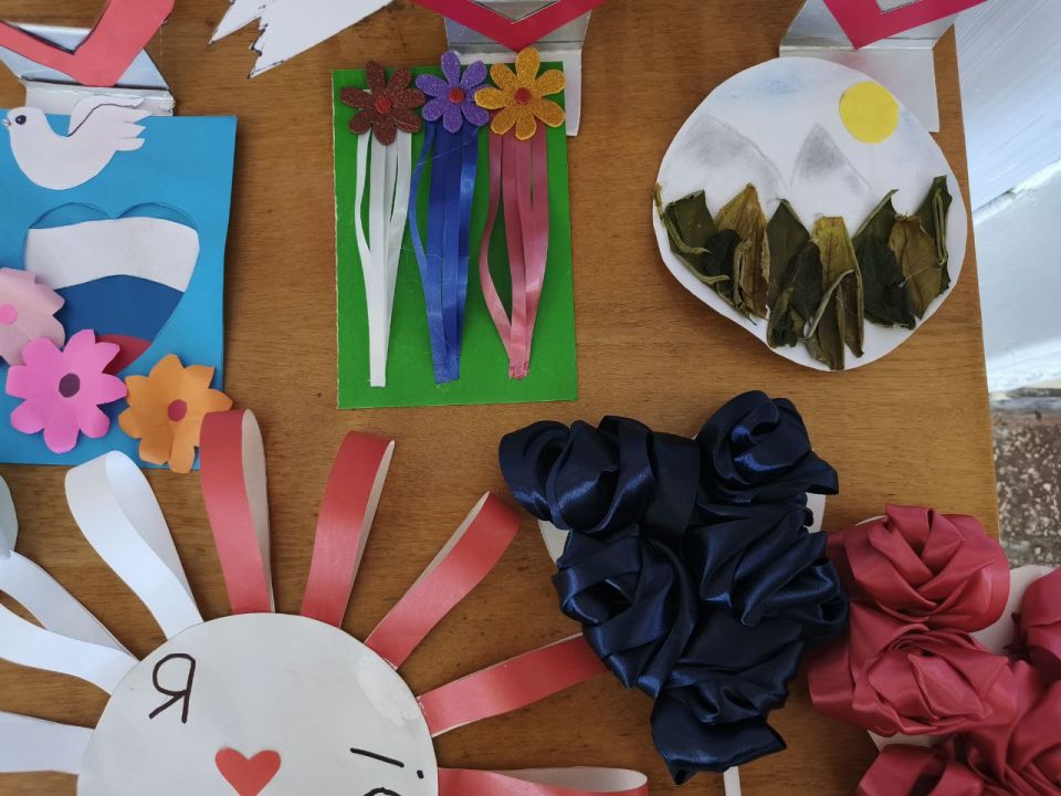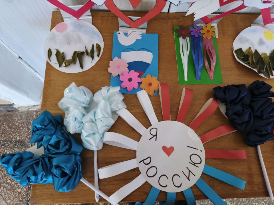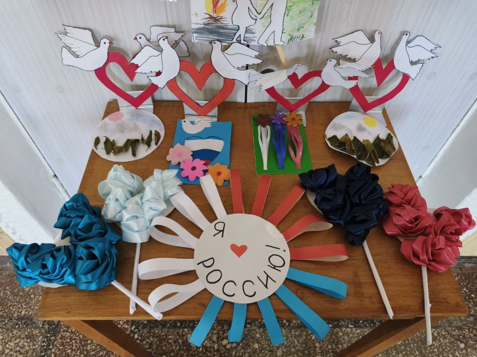Выставка носит название "Я люблю Россию!" и включает в себя как рисунки, так и поделки. Вниманию представлены изображения русских народных костюмов, триколор, пейзажи, а также голуби, олицетворяющие мир.