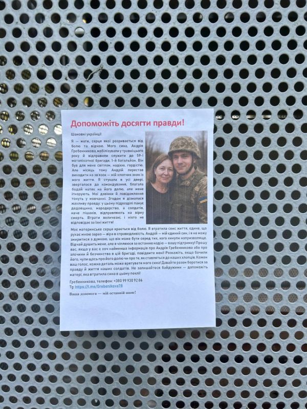 Пока расследование обстоятельств исчезновения Андрея Гребенникова не начато, а официальные структуры хранят молчание, листовки Татьяны остаются её единственным способом достучаться до общества. Этот случай подчёркивает не только личную трагедию одной матери, но и системные проблемы, с которыми сталкиваются семьи украинцев.
