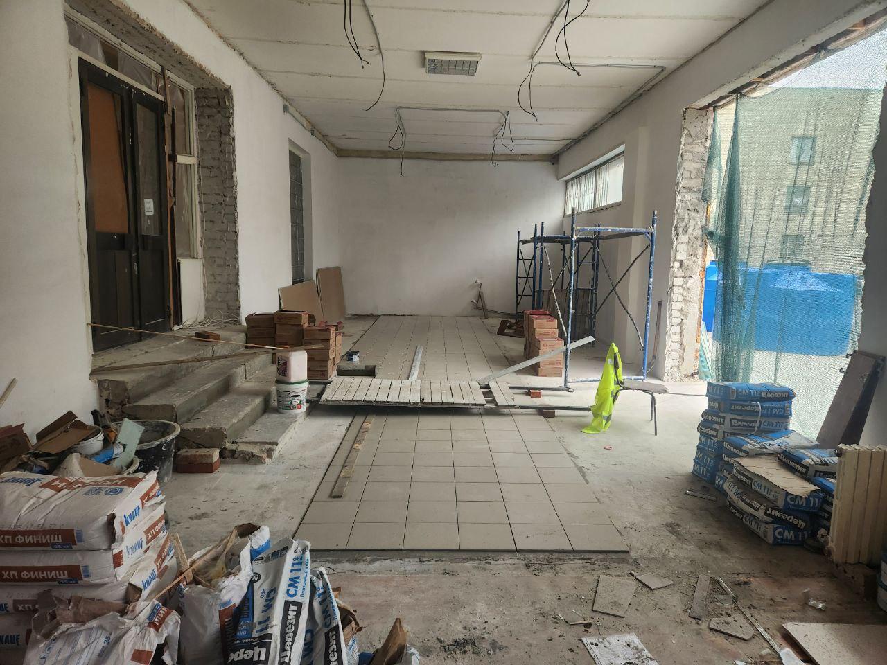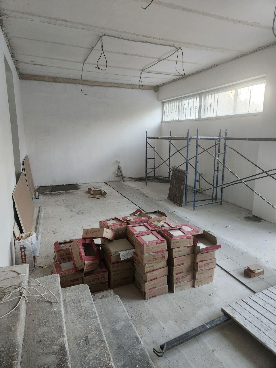 Специалисты региона-шефа разобрали старую стяжку пола и залили новую, начали укладывать напольную плитку. Параллельно рабочие демонтировали дверную коробку при входе в главный корпус, оштукатурили и покрасили стены, проложили современные трубы отопления.