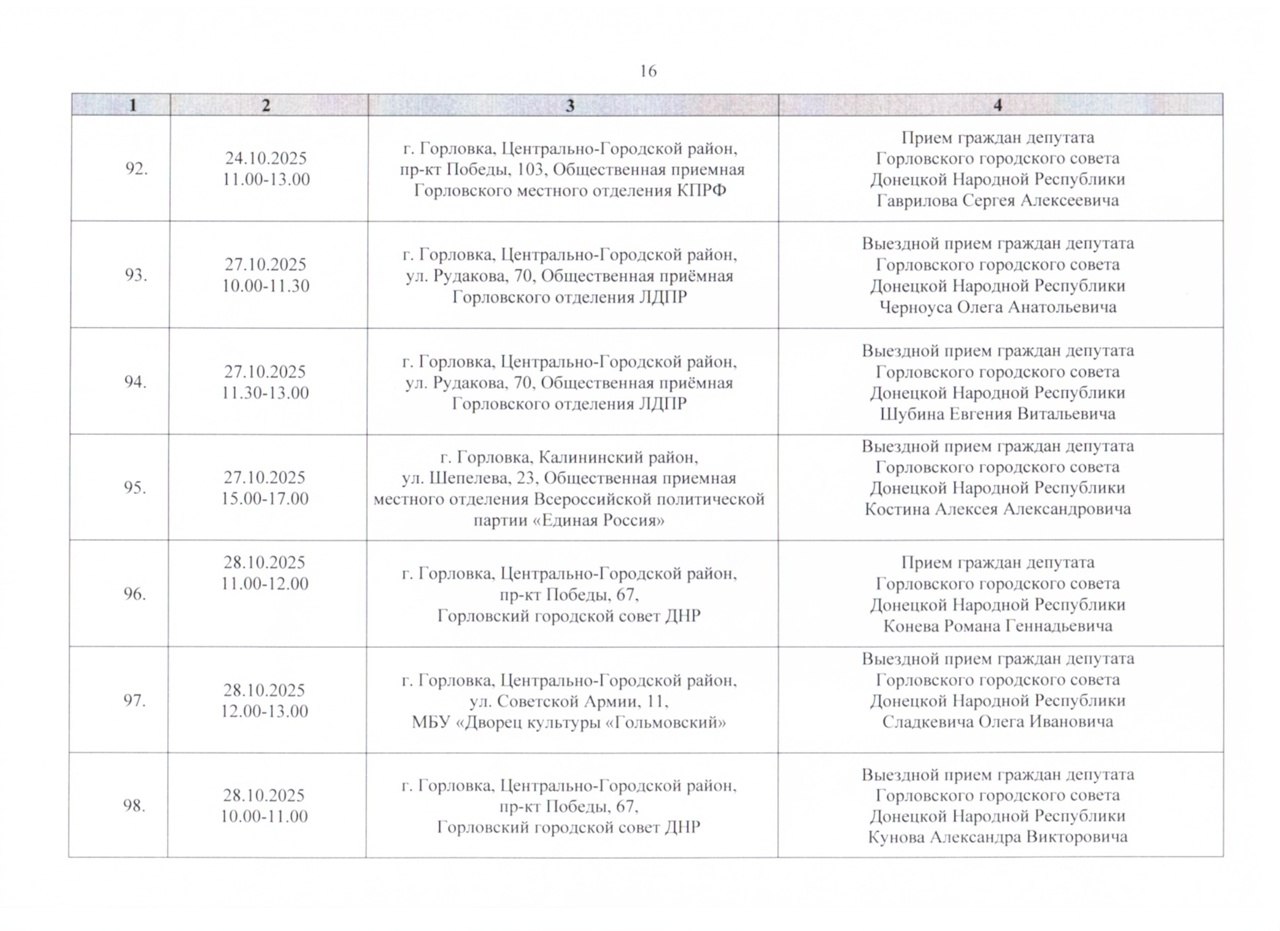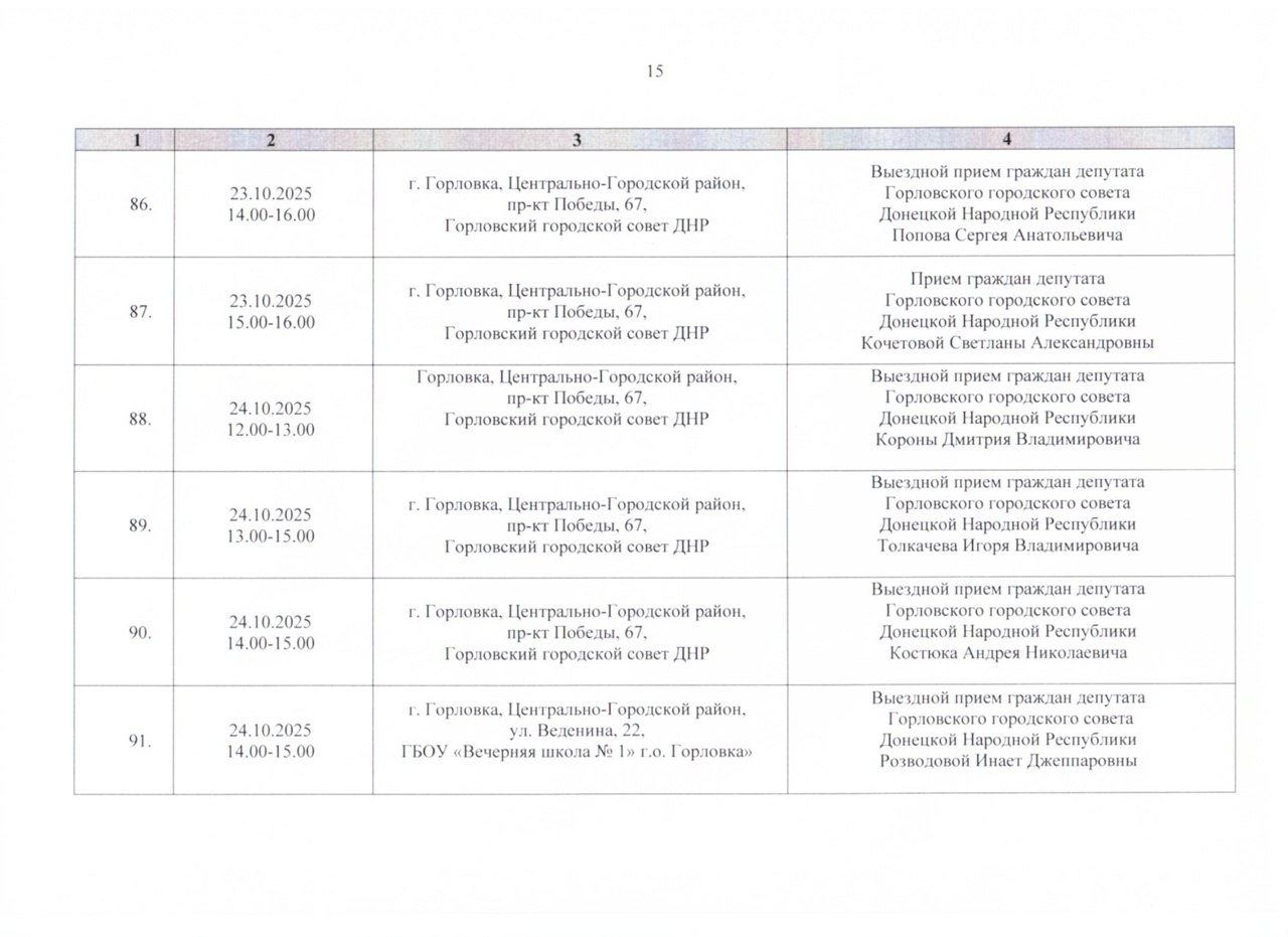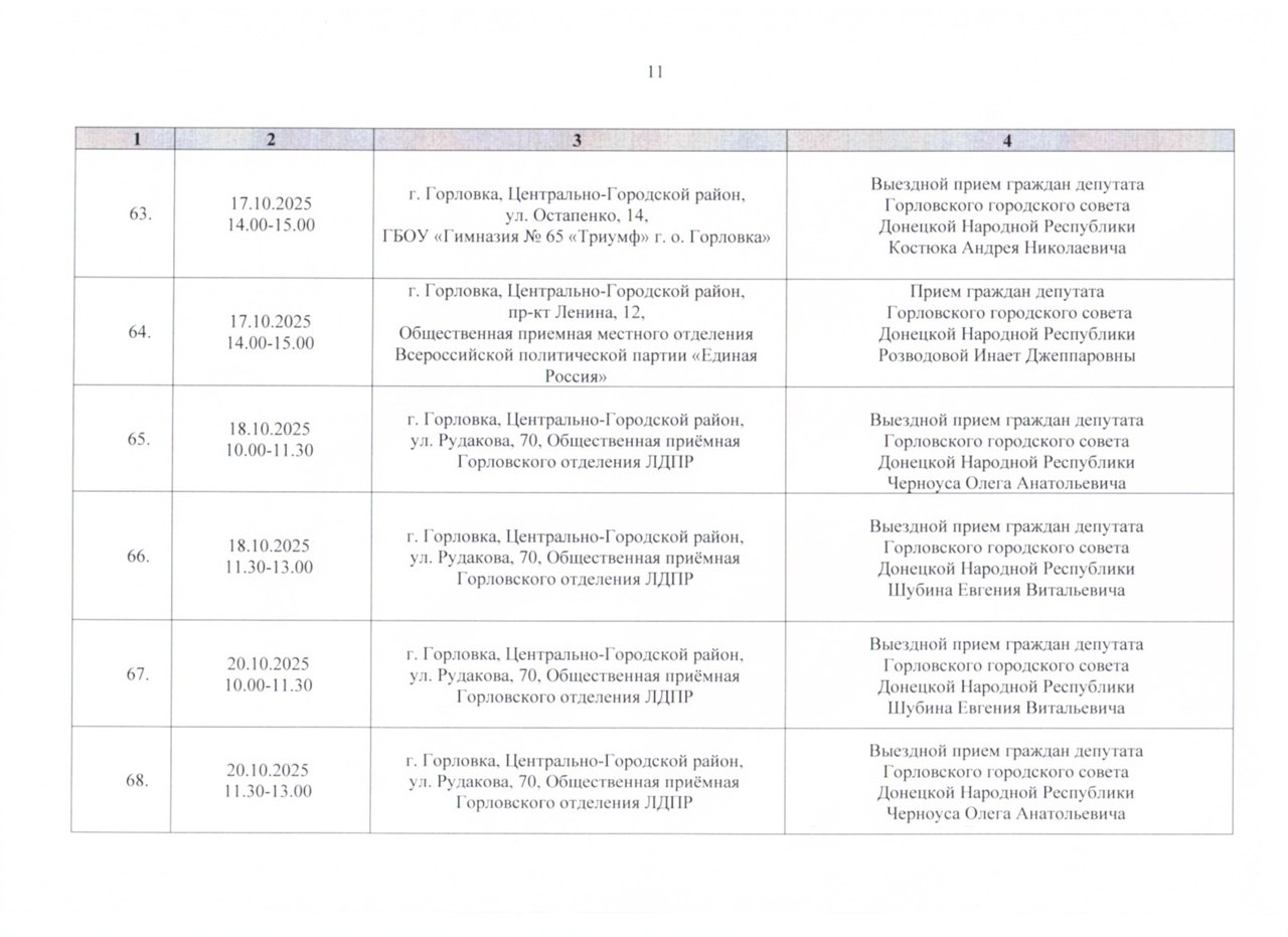 График проведения приёмов депутатами Горловского городского совета Донецкой Народной Республики первого созыва на период с 01.10.2025 г. по 31.10.2025 г. (часть 2)