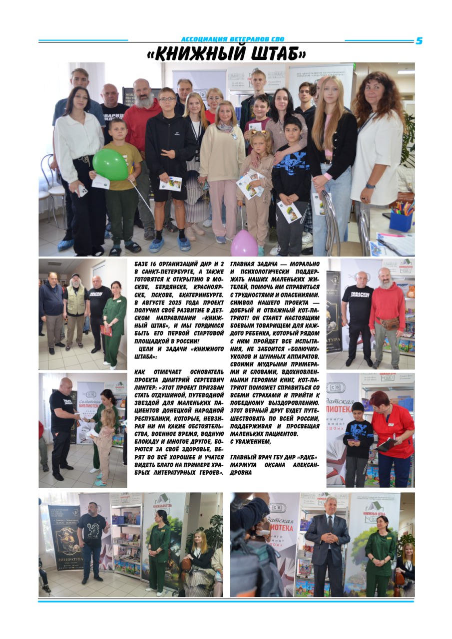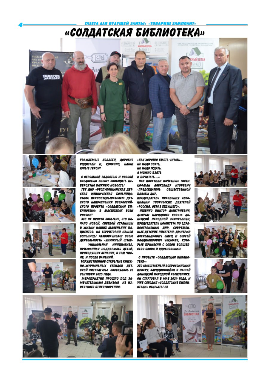 Солдатская библиотека – проект, который зародился в нашей Донецкой Народной Республике и уже стал традицией. Стартовал в мае 2024 года с открытия первой «Солдатской библиотеки» в г. Донецке в Институте неотложной и восстановительной хирургии им. В. К. Гусака. На сегодняшний день такие библиотеки открыты на базе 16 организаций Донецкой Народной Республики.