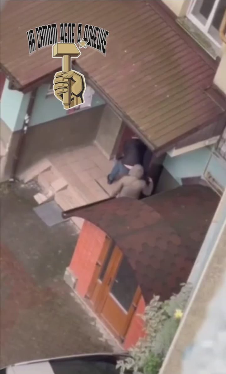 Это «добровольная» могилизация в подъезде Ивано-Франковска на западной Украине. Мужчину тянули двое одетых по гражданке в присутствии полицая.