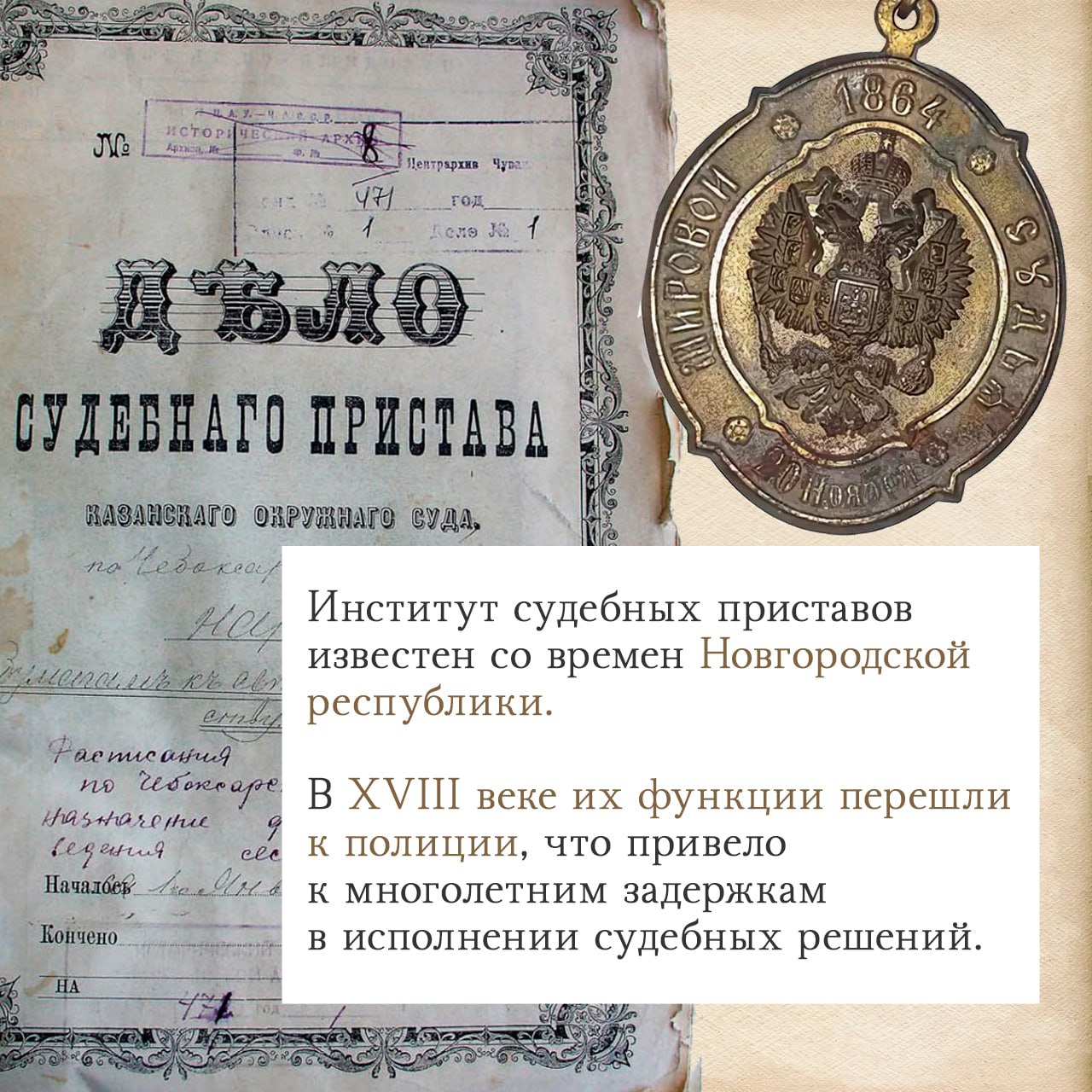 История службы судебных приставов уходит корнями во времена Новгородской республики. Тогда существовали должностные лица, выполнявшие функции по обеспечению исполнения судебных актов. Однако со временем эти обязанности перешли к полиции, что привело к снижению эффективности судебной системы.