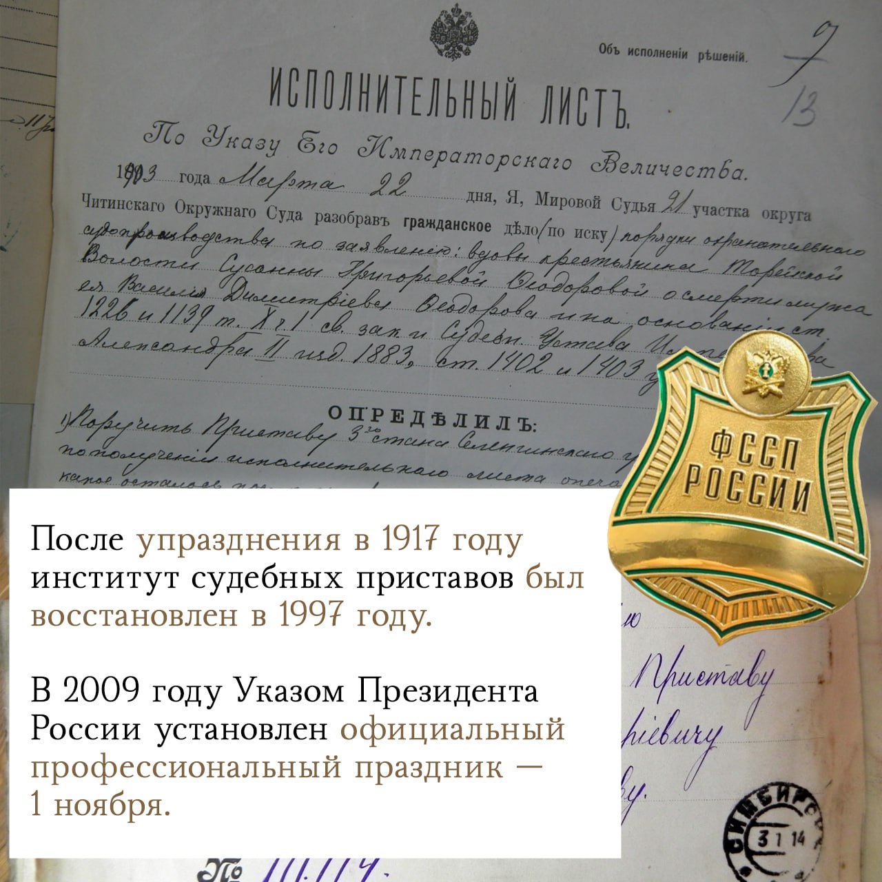 После революции 1917 года институт судебных приставов был упразднён, а его возрождение состоялось в 1997 году с принятием федеральных законов «О судебных приставах» и «Об исполнительном производстве». В 2009 году Указом Президента Российской Федерации официально установлен День судебного пристава.