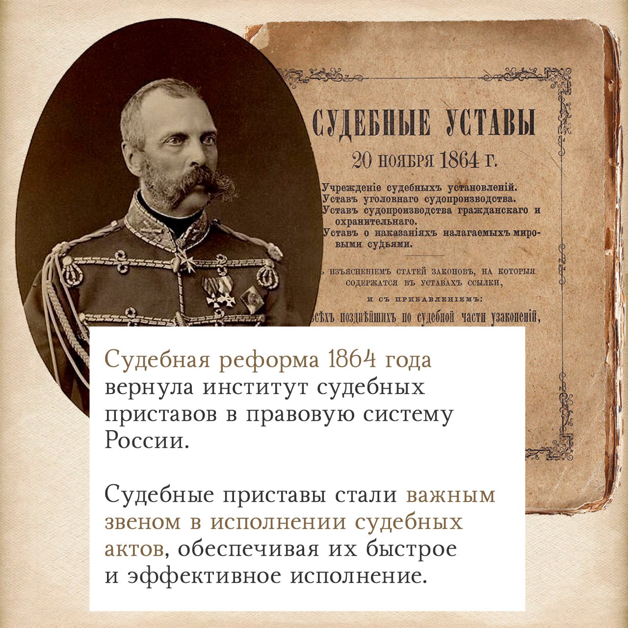 Решением стала судебная реформа императора Александра II. В ходе неё 20 ноября 1864 года были утверждены Судебные уставы, а 1 ноября 1865 года (19 октября — по старому стилю) специальным указом государя был закреплён правовой статус судебных приставов. Именно эта дата стала профессиональным праздником, и в 2025 году служба отмечает 160-летний юбилей.