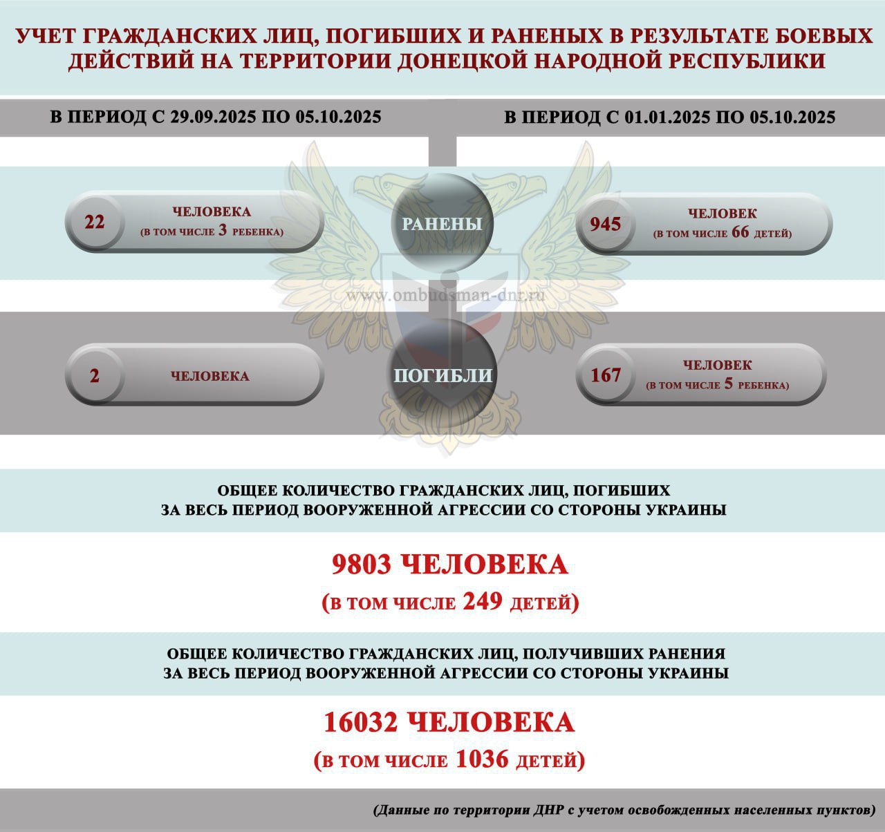 За прошедшую неделю с 29 сентября по 5 октября в ДНР в результате обстрелов ВСУ погибли 2 мирных жителя, ранения получили 22 мирных жителя, в том числе три ребёнка.