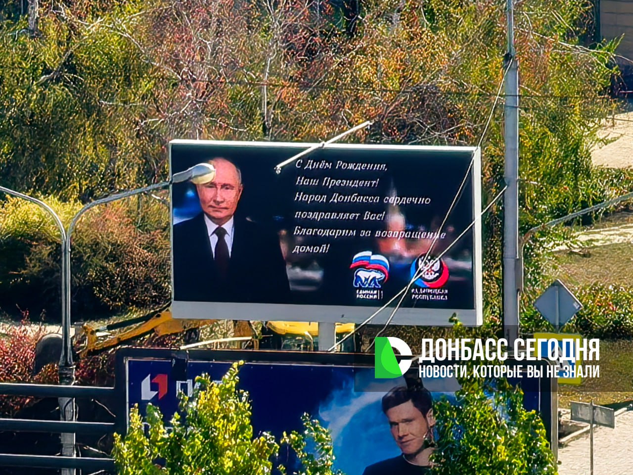 Среди прочих рекламных бордов в Донецке можно встретить поздравление Президента РФ Владимира Путина с Днём Рождения. Сегодня наш лидер отмечает 73 года!