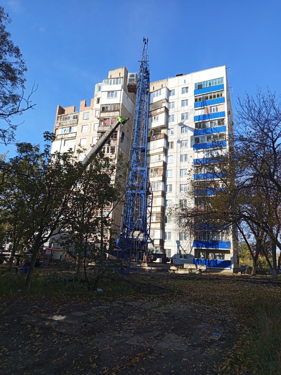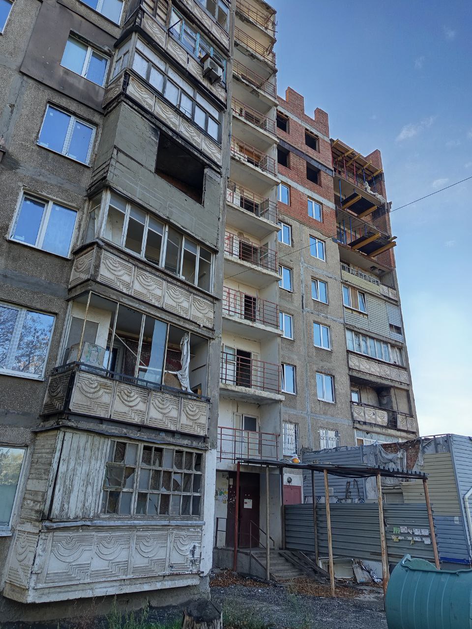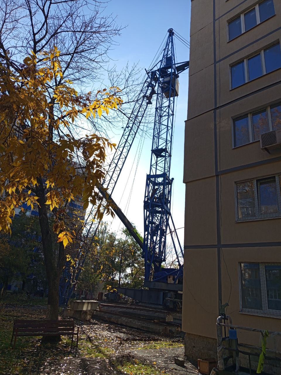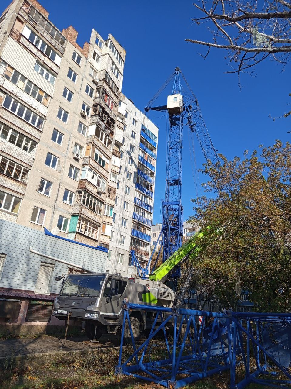 На пр. Победы, 110 скоро начнется очередной этап восстановления дома. Сейчас там идёт монтаж подъёмного крана. Часть дома необходимо достраивать - повреждения получены большие. Жители оставили надпись: "SOS дом топят дожди".
